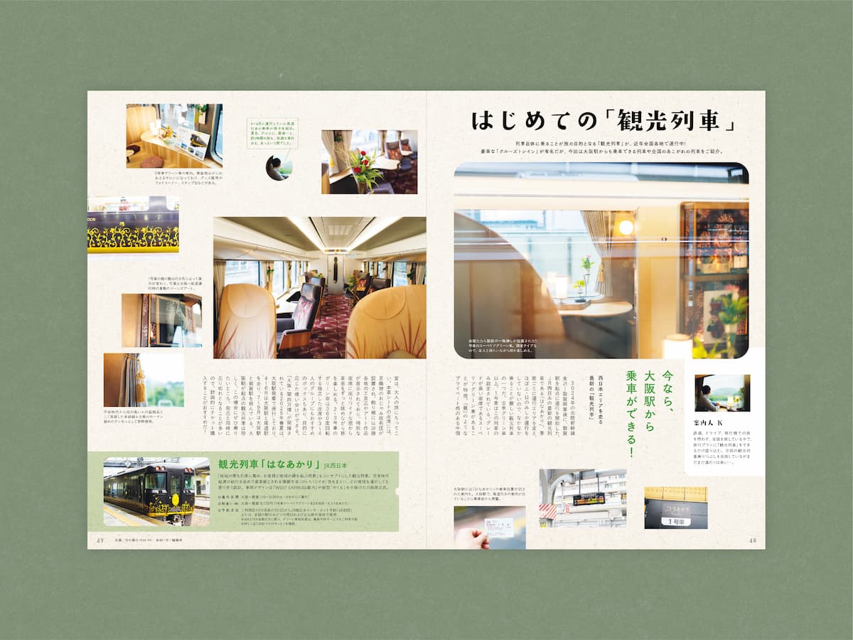 今回のテーマは「旅」。関西だけでなく、四国・山陰地方から、北海道のエスコンフィールドまで、ゆったりと楽しむ一味違う大人の旅本となりました。旅の内容に沿って、落ち着きのあるトーンから明るく楽しい雰囲気まで、さまざまなデザインの誌面に仕上がりました。前回に引き続き、ガラスペンでの手描き文字も使用しています。