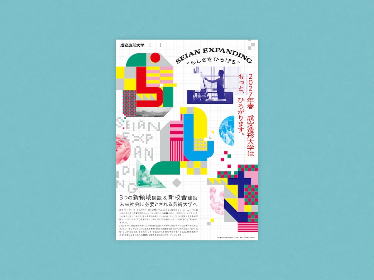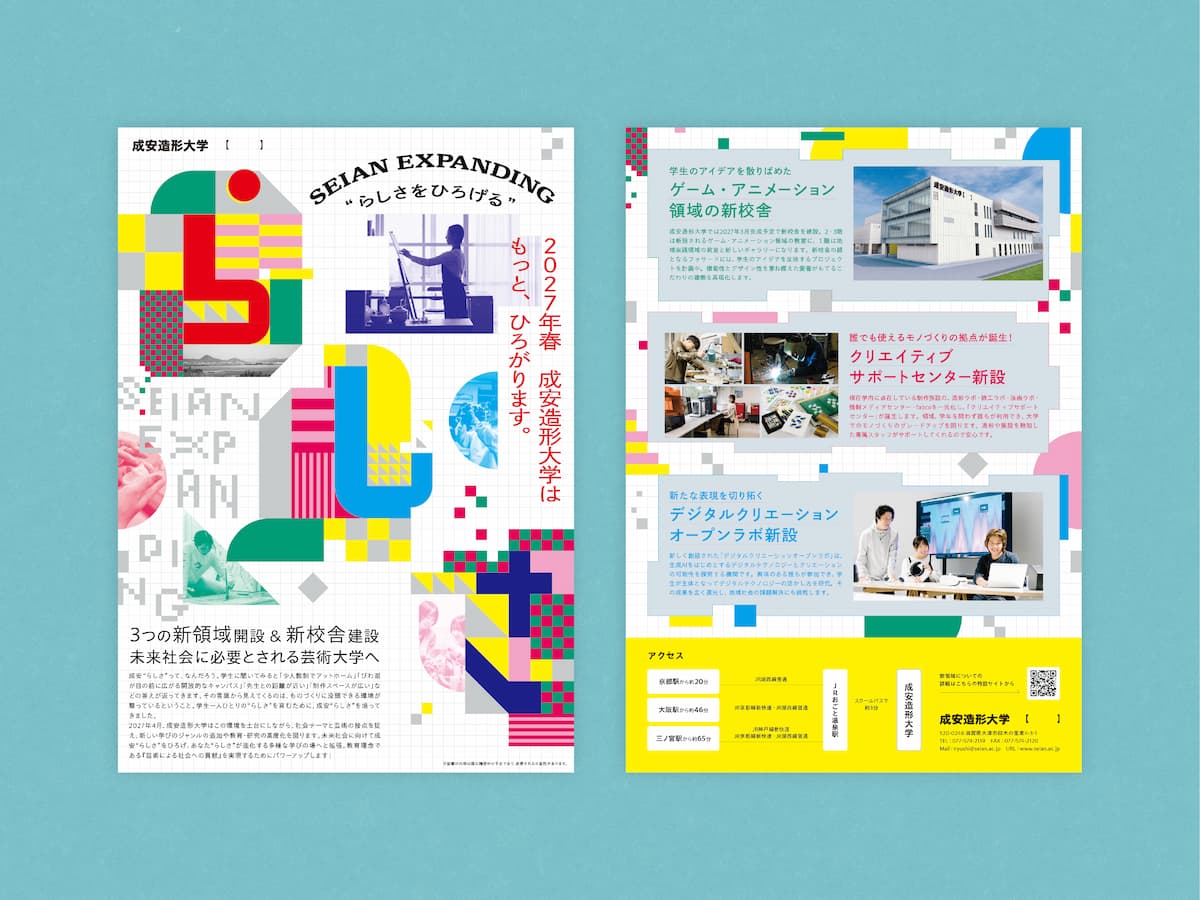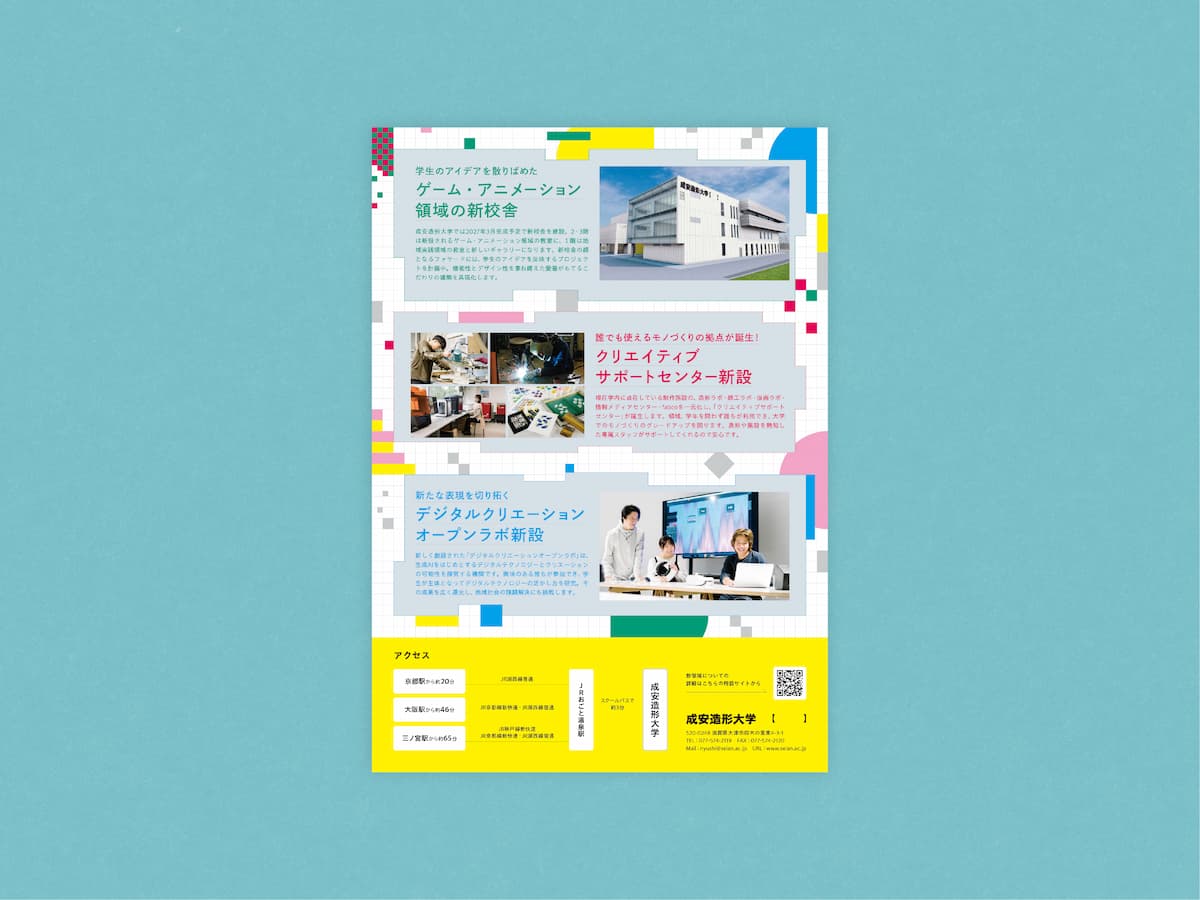 滋賀にある成安造形大学の新領域開設&新校舎建設についてのメインビジュアルをはじめ、チラシ等のデザインを担当しました。
