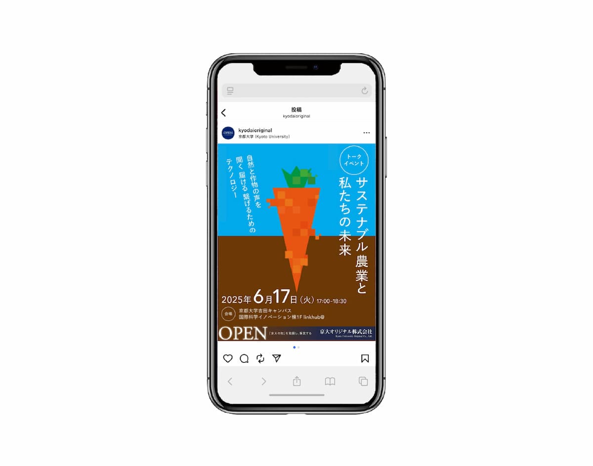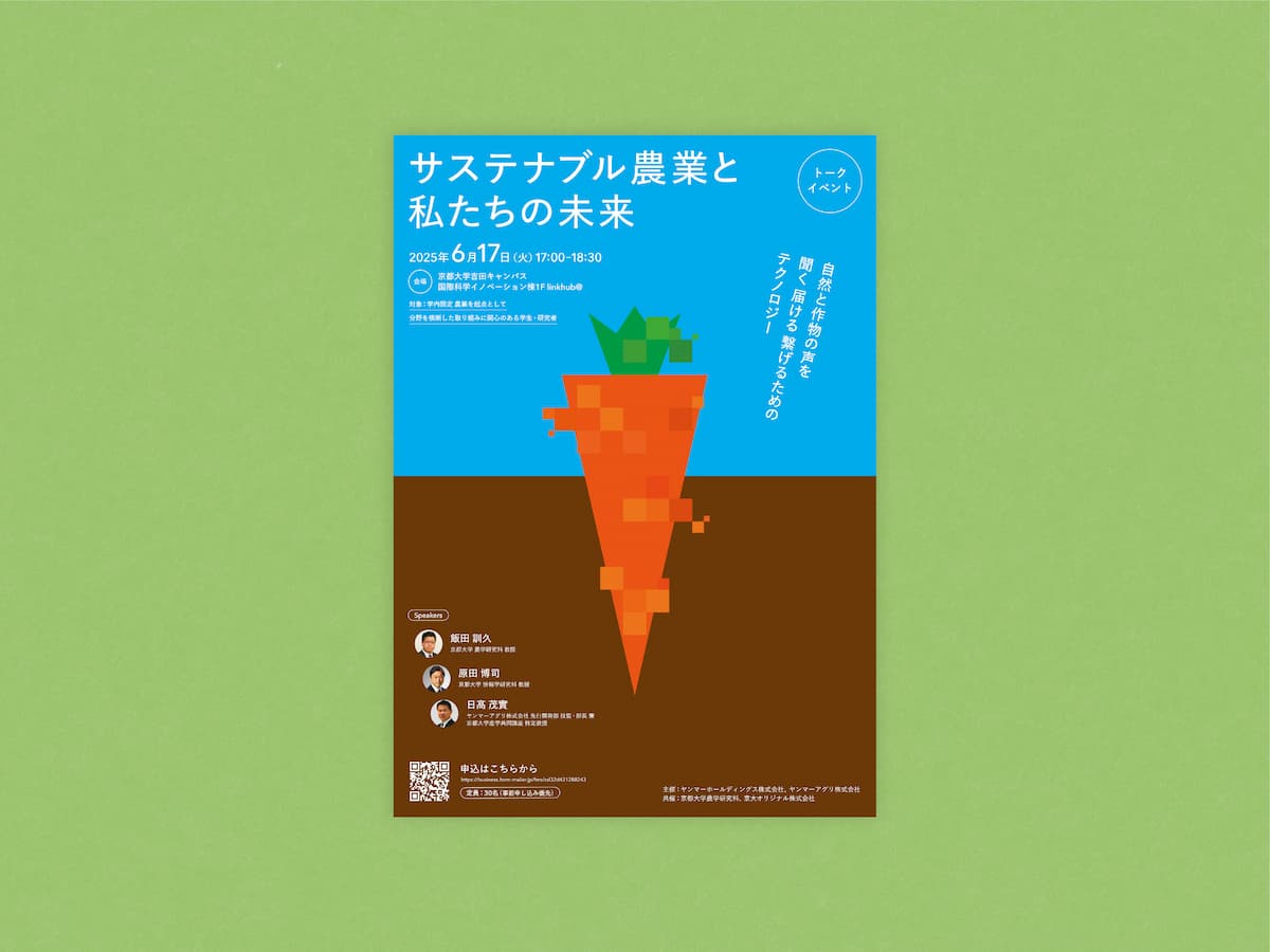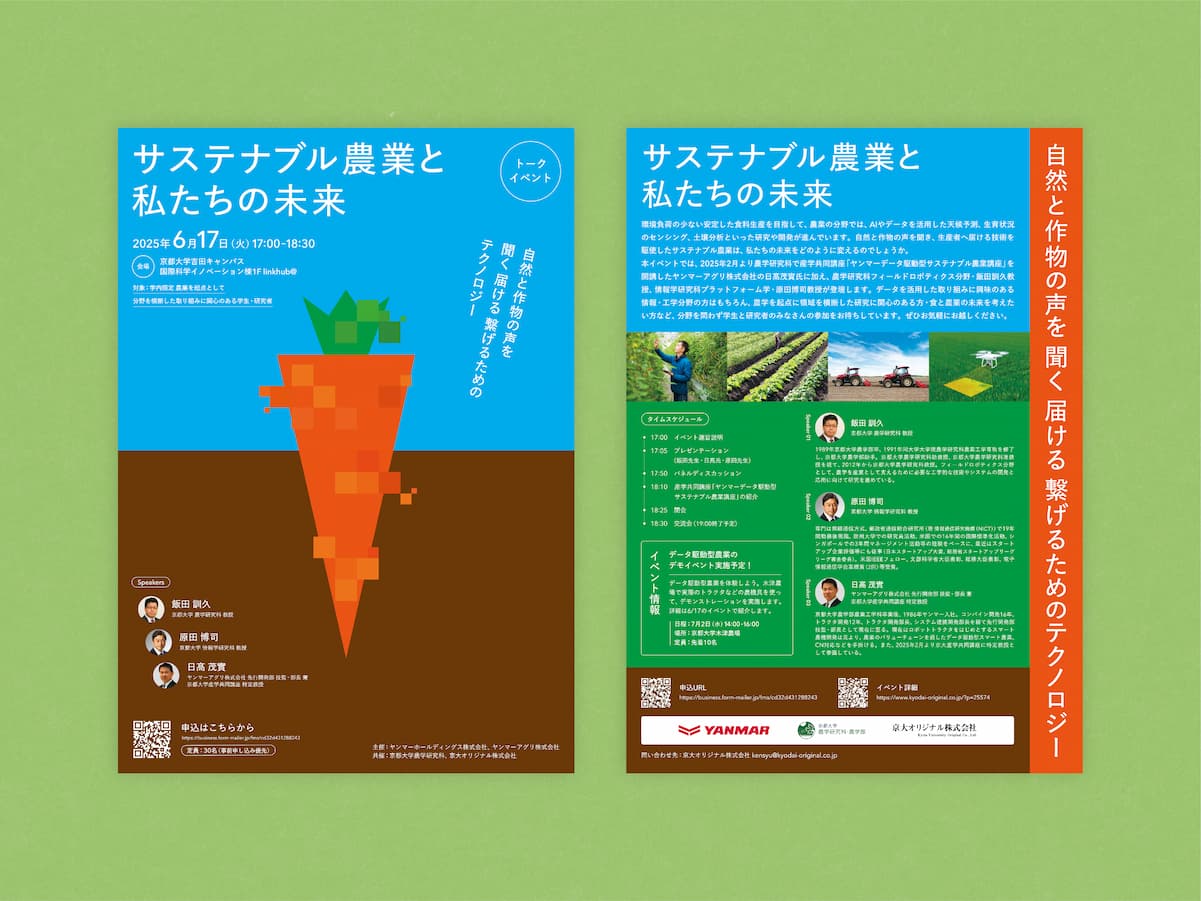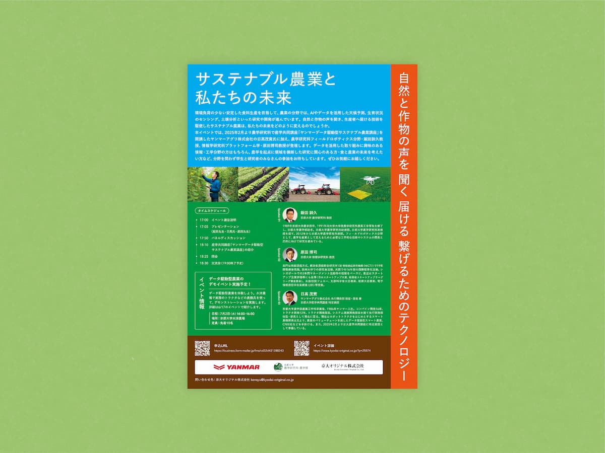 京都大学農学研究科と京大オリジナル株式会社が共催するトークイベント「サステナブル農業と私たちの未来」のフライヤーのデザインを担当しました。