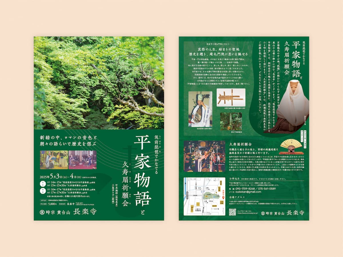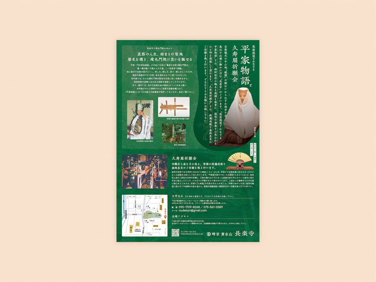 京都東山にあるお寺・長楽寺で執り行われた「筑前琵琶でかなでる平家物語と久寿扇祈願会」のフライヤーのデザインを担当しました。