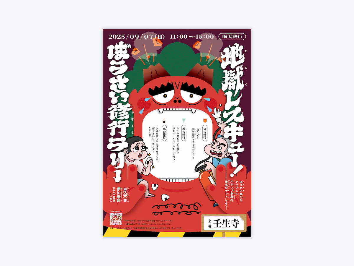 京都にある壬生寺で行われた子ども向け防災イベント「地獄レスキュー! ぼうさい修行ラリー」のチラシをはじめとした、会場デザインやスタンプラリーなどのデザインを担当しました。